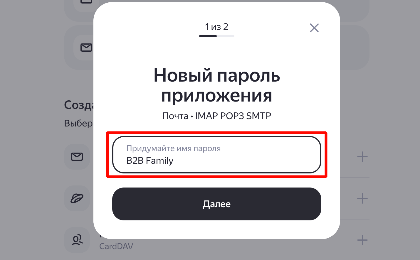 Создание пароля приложения: создание названия пароля