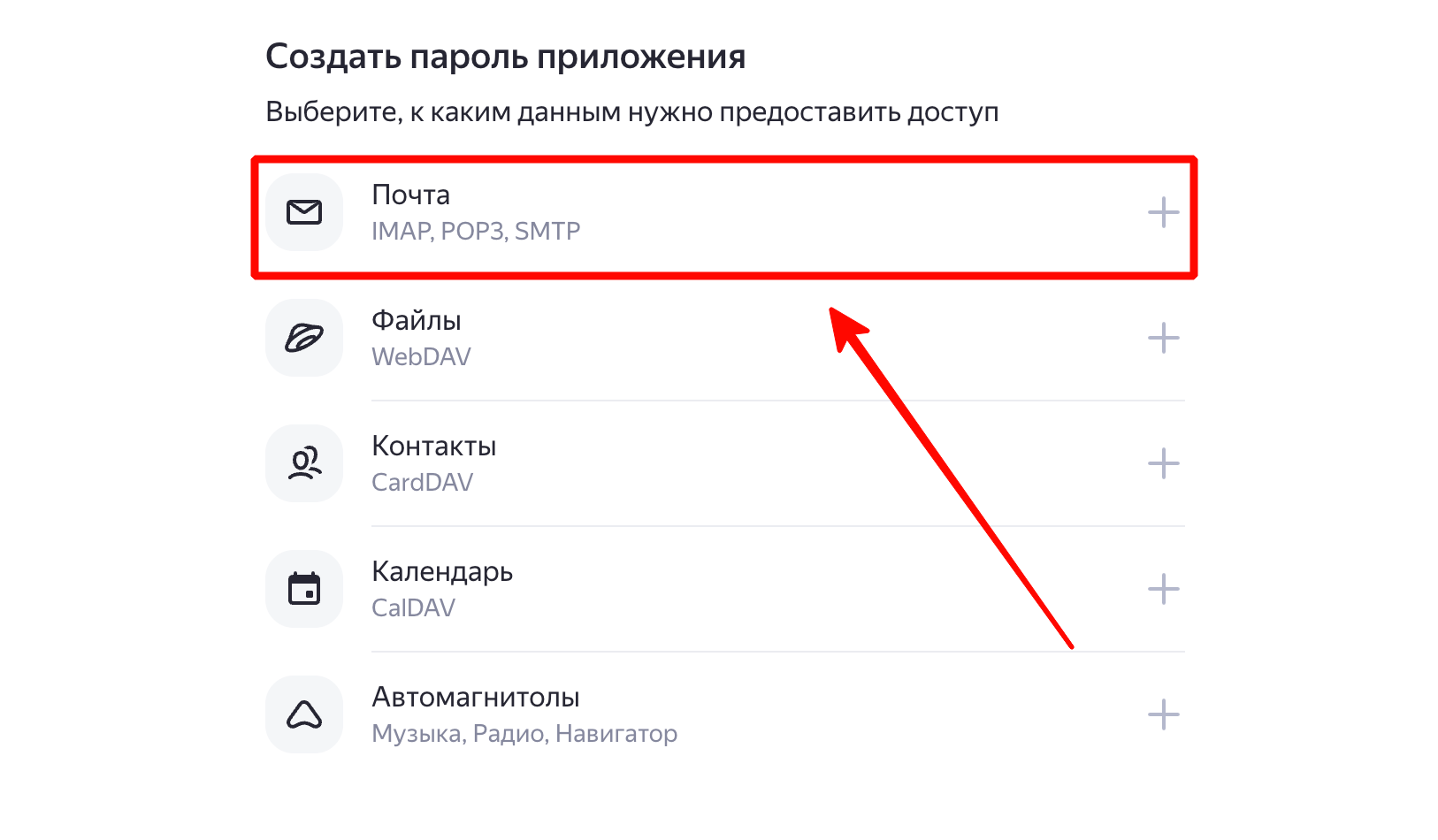 Создание пароля приложения: выбор типа приложения